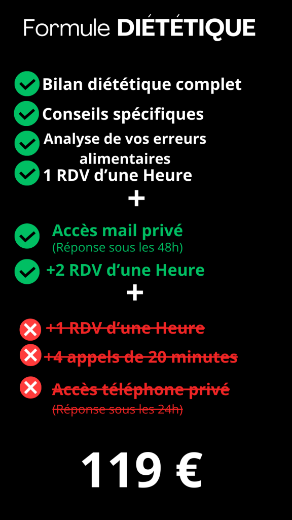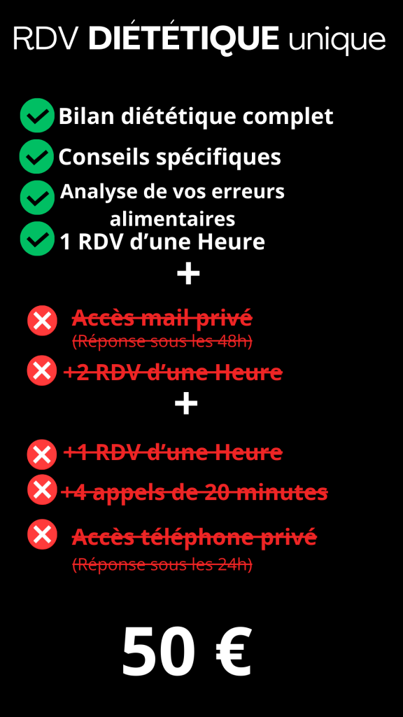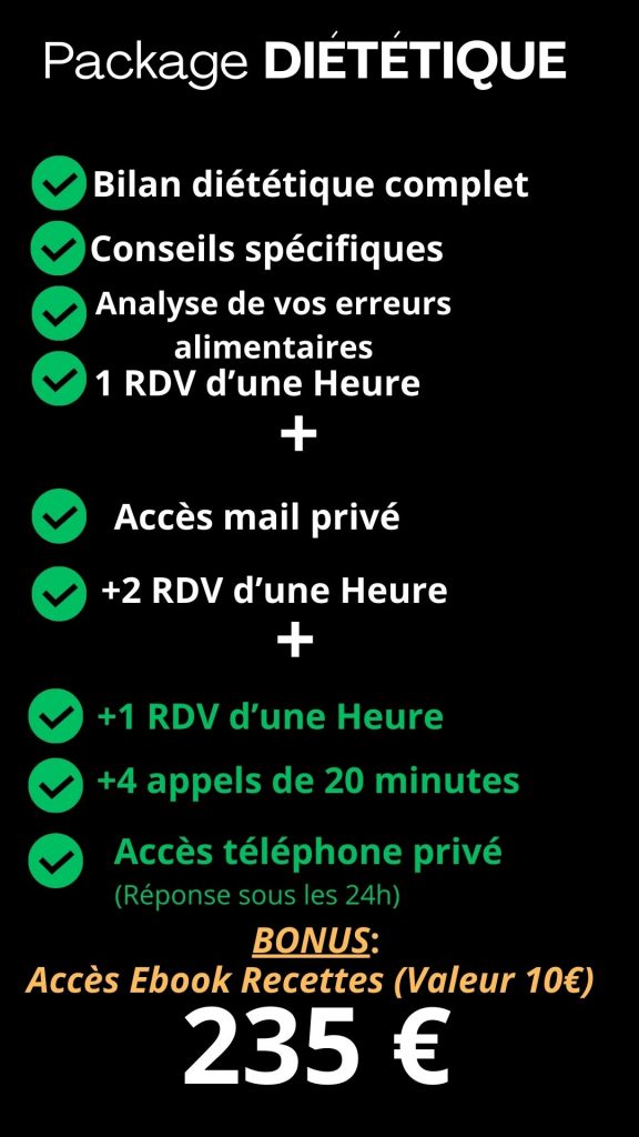 Le Package Diététique comprend 4 RDV, durant chacun 1h. Il contient également 4 appels d’environ 20min. Vous avez accès à mon mail et mon numéro privé (ainsi, même en déplacement je peux vous répondre (uniquement SMS)), permettant de me poser n’importe quelle question d’ordre diététique à laquelle je répondrai sous 24h.